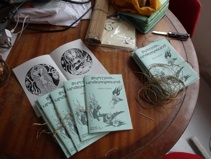 40 pages sur papier recyclé 90g. Couverture en papier artisanal indien bleu. Relié à la main et numéroté de 1 à 100, chaque recueil est unique... format A5. 8 euros.